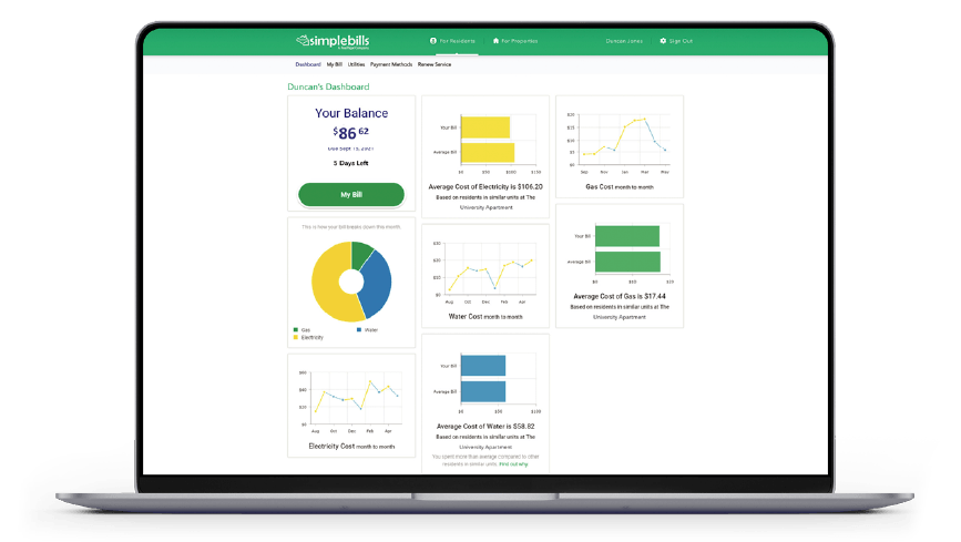 Your Dashboard will provide insight into cost & usage of utilities each month.